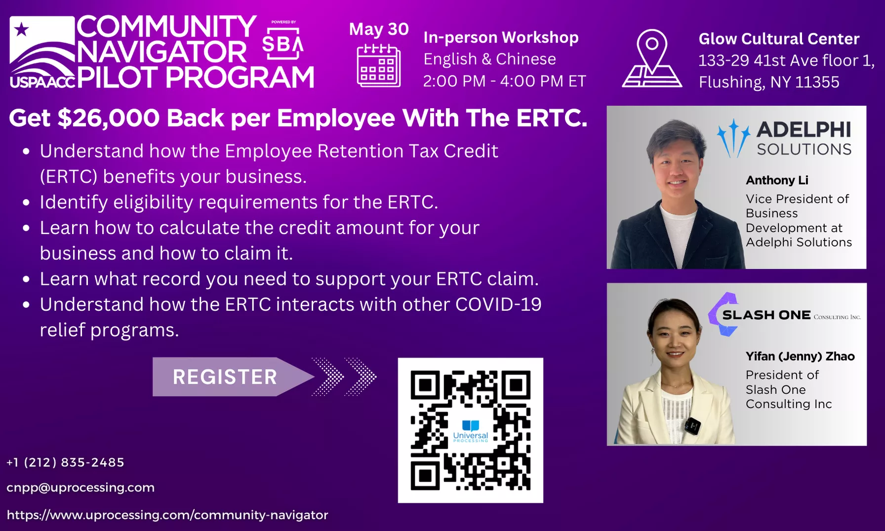 Are you aware of a government tax credit that could reward your business for retaining your loyal staff during the challenging times of the pandemic? We're inviting you to our exclusive, free in-person workshop focused on the Employee Retention Tax Credit (ERTC). The ERTC is a refundable tax credit that was designed to motivate businesses to keep their workforce intact during the COVID-19 crisis. In this value-packed workshop, we aim to empower small business owners like you by: