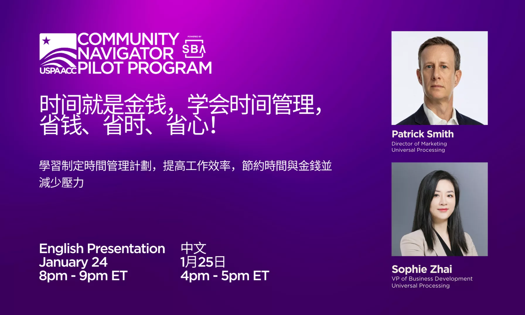 活动描述:您有多少次因为未完成当天工作加班加点到深夜?您有多少次午餐都来不及吃只为了完成更多工作?您有多少次不得不在紧急与非紧急的任务当中进行取舍?时间对于每一位经营者来说都是最宝贵的,而浪费时间就是在浪费金钱。时间不会悄无声息的流逝,当你有意识的利用安排好时间就会发现还有很多可以调整的地方。时间管理,简单的讲就是要提前做好规划以及使用一定的技巧、方法等,去更有效率地运用时间。赶快加入我们1月24日和25日的免费网络研讨会,学习制定时间管理计划,提高工作效率,节约时间与金钱并减少压力!我们将提供官方 FDIC/SBA 金融课程、中英文演示文稿以及可用于专门帮助您提升业务的工具包。立即注册,让我们帮助您在 2023 年省钱、省时、省心!来自行业专家的时间管理技巧分享:了解并找到最适合您的时间管理策略熟知全面的时间管理计划步骤围绕您的计划安排工作内容,以确保其顺利运行设定短期和长期目标来提高您的工作效率学习目标:我们在此为您提供每一个细节的帮助。我们的免费网络研讨会旨在向创业者介绍时间管理的关键方向,并向他们展示不同的策略。学习帕累托分析、ABC 方法、艾森豪威尔方法和 POSEC 方法等常用实践模型。了解每种方案将如何帮助您的业务,并找出最适合您的方案。学习如何正确设定可实现的目标以及如何确定任务的优先程度来实现这些目标。通过学习 FDIC/SBA 官方课程,时间管理将变得轻而易举!欢迎点击下方的链接免费注册我们 1 月 24 日的英文版或 1 月 25 日的中文版网络研讨会!