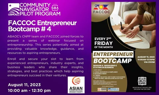 ABAOC CNPP team in collaboration with the Filipino American Chamber of Commerce (FACCOC) organized the fourth and final session of the FACCOC Entrepreneur Bootcamp webinar series.