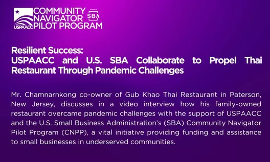 Learn how the Thai Restaurant overcame pandemic challenges with the support of USPAACC and the U.S. Small Business Administration's Community Navigator Pilot Program (CNPP).