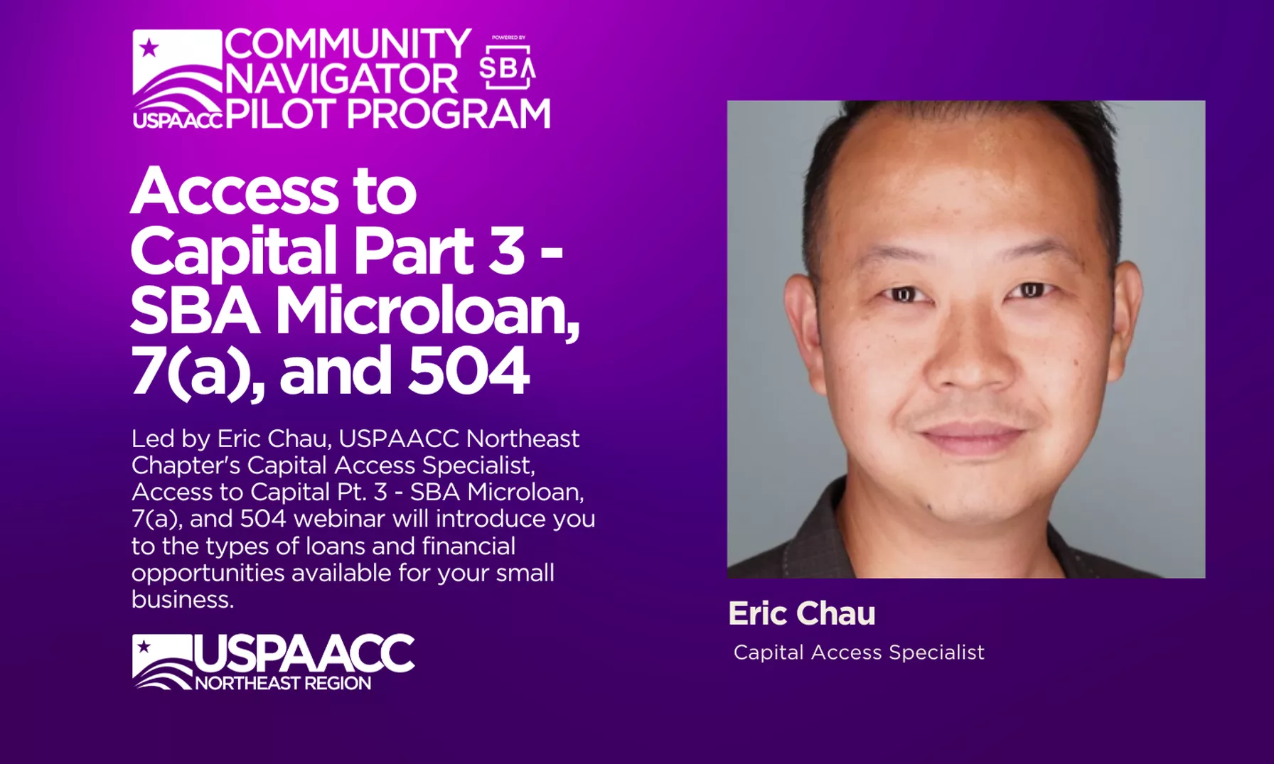 Led by Eric Chau, USPAACCNortheast Chapter’s Capital Access Specialist, Access to Capital Pt. 3 — SBA Microloan, 7(a), and 504 webinar will introduce you to the types of loans and financial opportunities available for your small business.