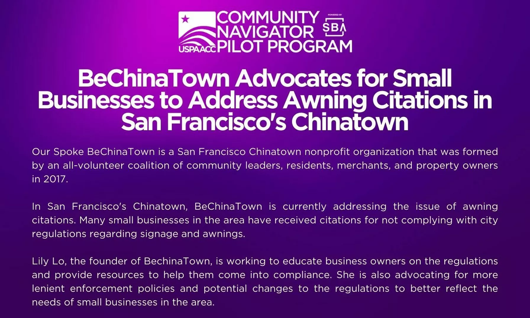 Lily Lo, the founder of BeChinatown, has taken the initiative to speak up and advocate for small businesses in the area. She raised awareness about the issue, by hosting multiple press conferences and explaining the confusing NOVs to business owners. She also reached out to the District Supervisor and San Francisco City to discuss possible solutions.