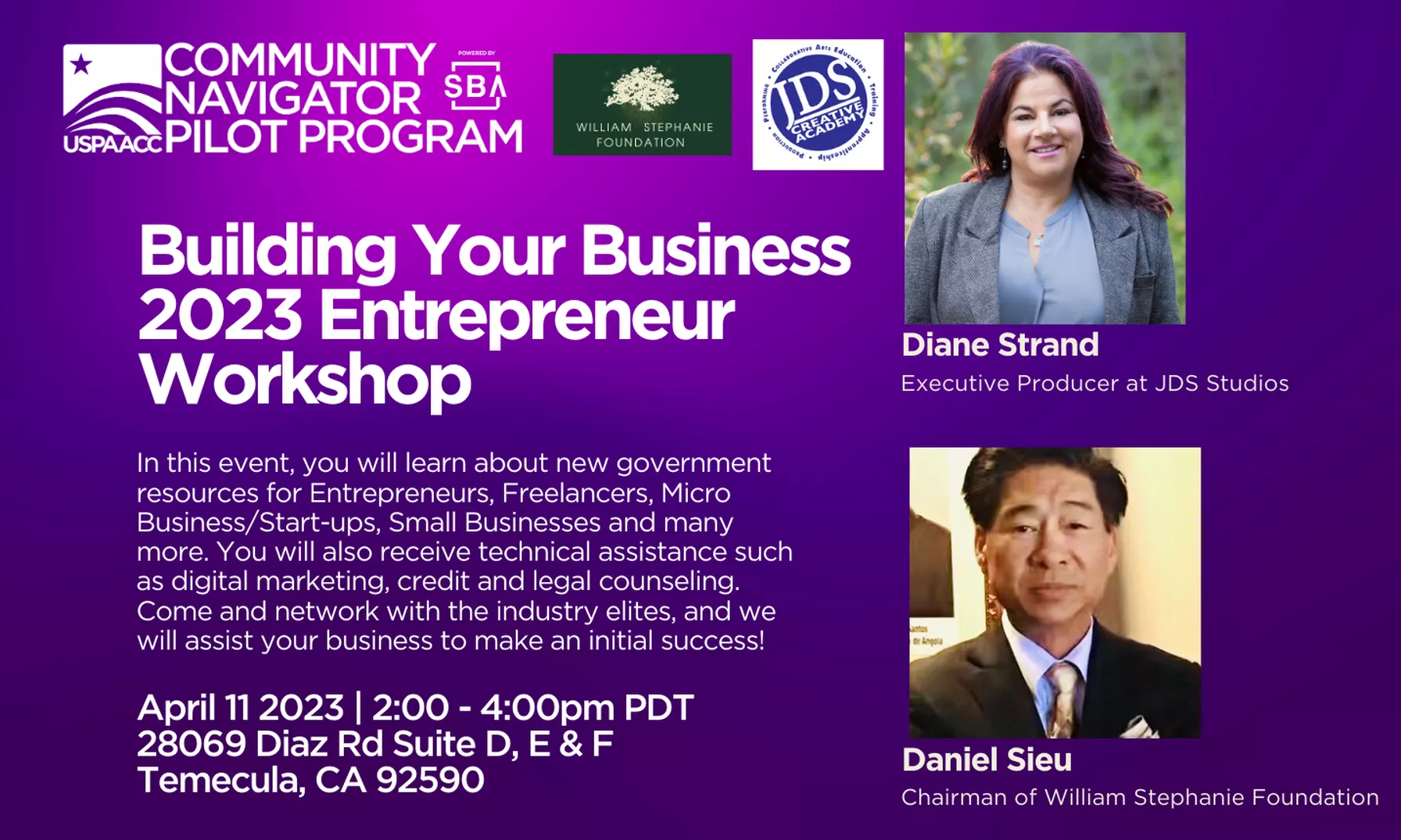 This workshop features keynote speaker Diane Strand, Executive Producer at JDS Creative Academy and Chairman of William Stephanie Foundation, Daniel Sieu. In this workshop, the audiences learnt about various strategies of marketing, business branding, the SBA Community Navigator Pilot Program, and the IRS Employee Retention Tax Credit Program.