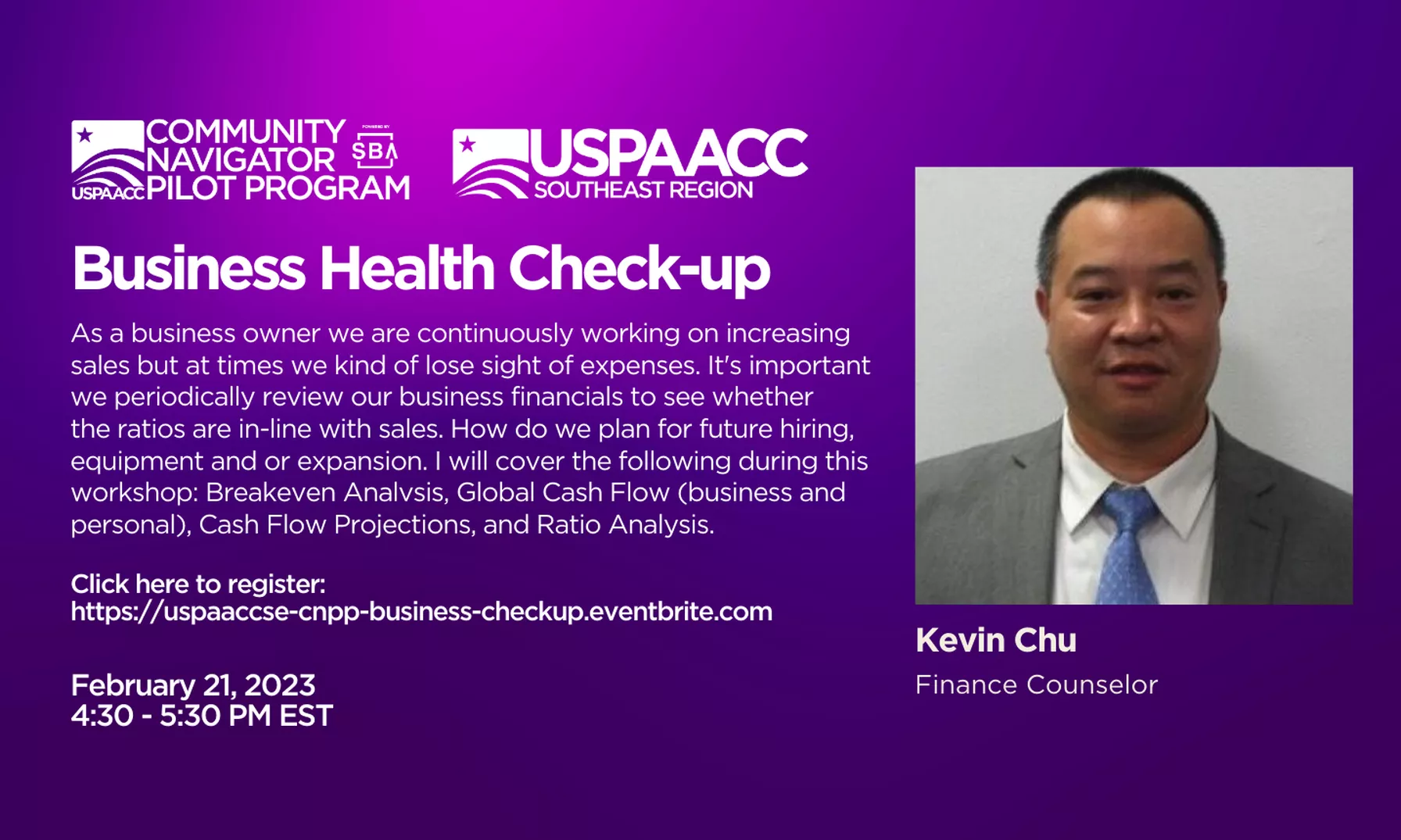 On 02/21/2023, USPAACC Southeast Chapter hosted a webinar on Business Health Check-up. 6 people attended!