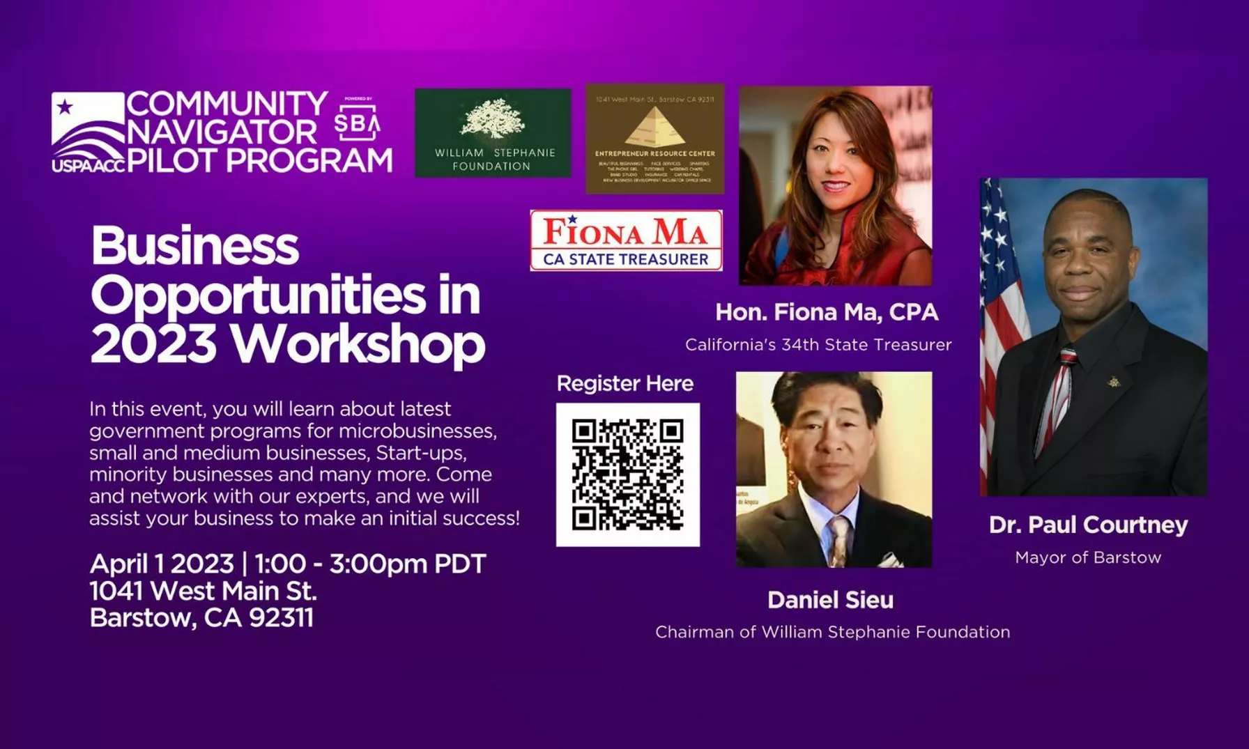 On 04/01/2023, William Stephanie Foundation, Barstow Entrepreneur Resource Center, and California State Treasurer Fiona Ma conducted a training workshop to promote various new incentive programs which the SBA and the U.S. State and Federal Government offer. 27 people attended!
