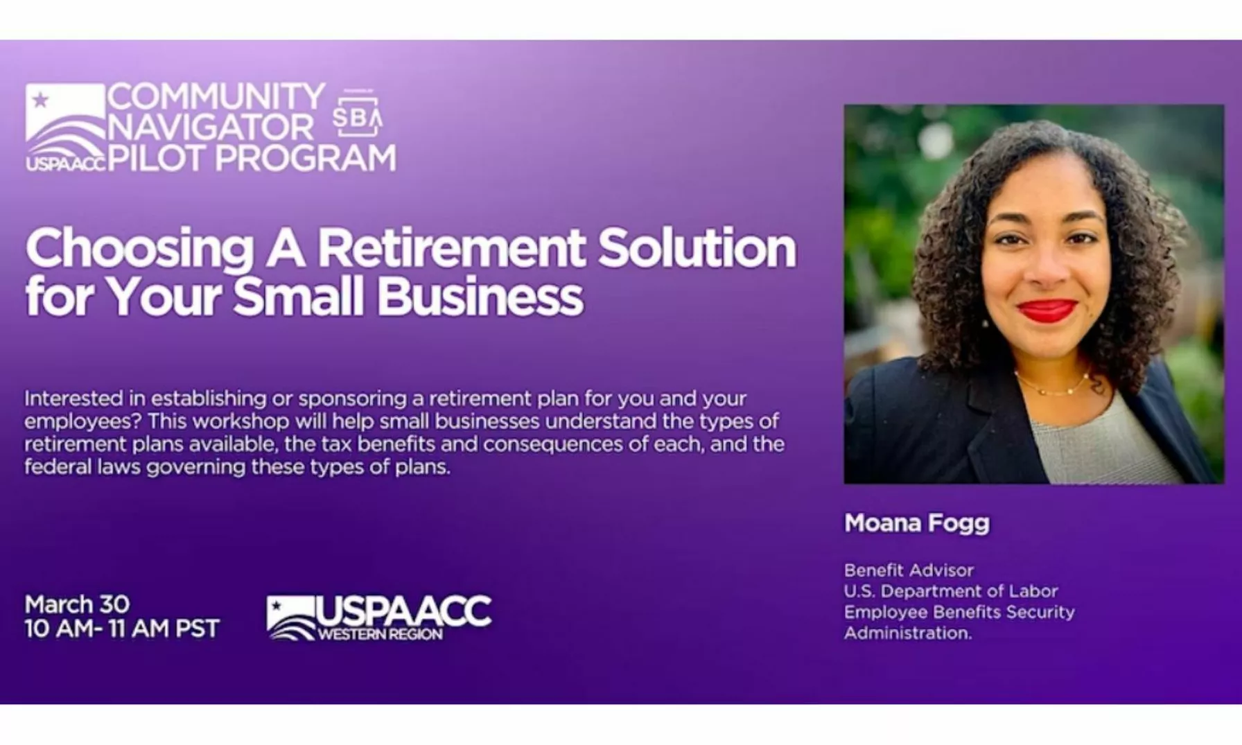 03/30/2023, USPAACC Western Chapter hosted a webinar to let small business owners know what the options are to choose their retirement plans. 9 people attended!
