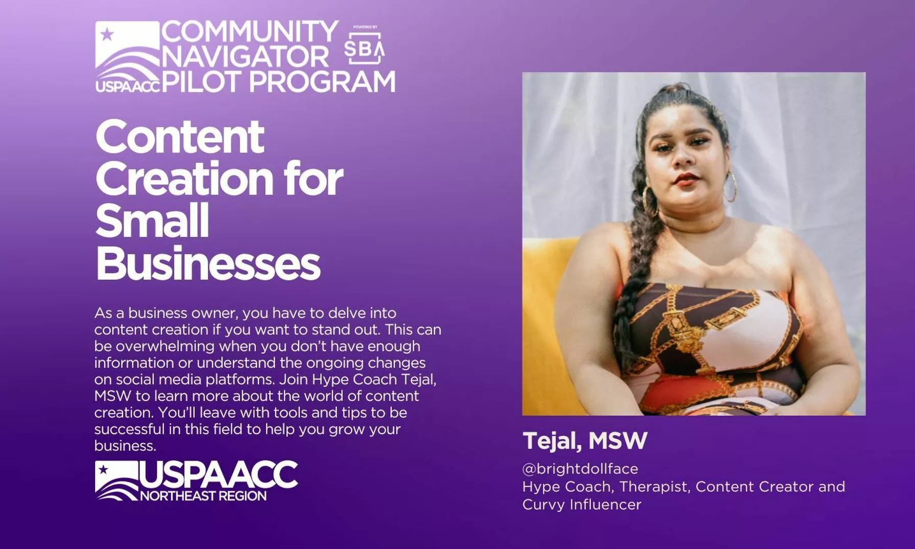 USPAACC Northeast Chapter hosted a webinar“Content Creation for Small Businesses” on September 8, 20227:00PM – 8:00PMEDT. As a business owner, you have to delve into content creation if you want to stand out. This can be overwhelming when you don’t have enough information or understand the ongoing changes on social media platforms. Join Hype Coach Tejal, MSW @brightdollface, Therapist, Content Creator and Curvy Influencer for this exciting webinar to learn more about the world of content creation. You’ll leave with tools and tips to be successful in this field to help you grow your business.