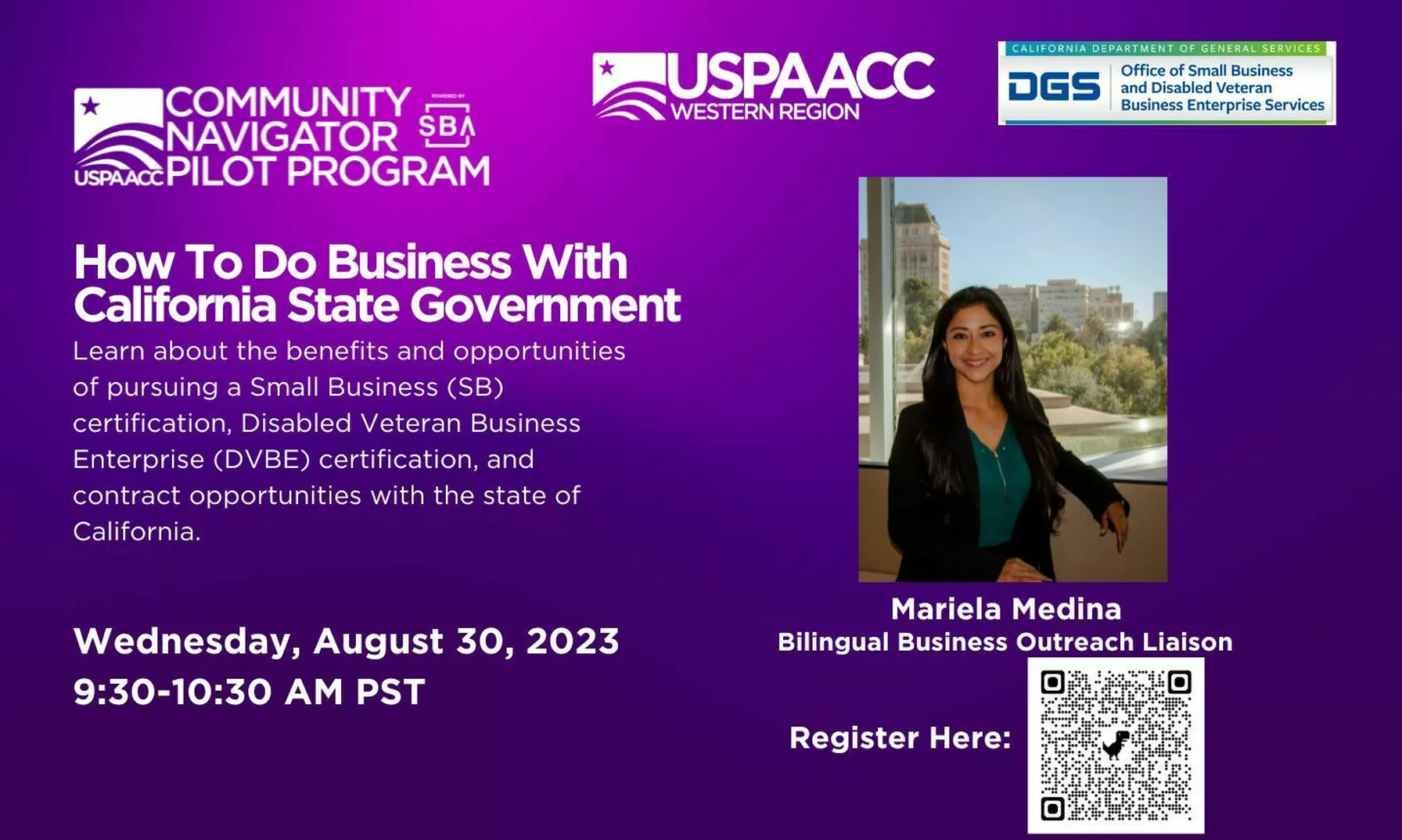 on 08/30/2023USPAACC Western Chapter organized a webinar titled “How to do Business with California State Government.” The event drew the participation of 56 attendees, all eager to gain insights into the intricacies of engaging in business with the state government of California.