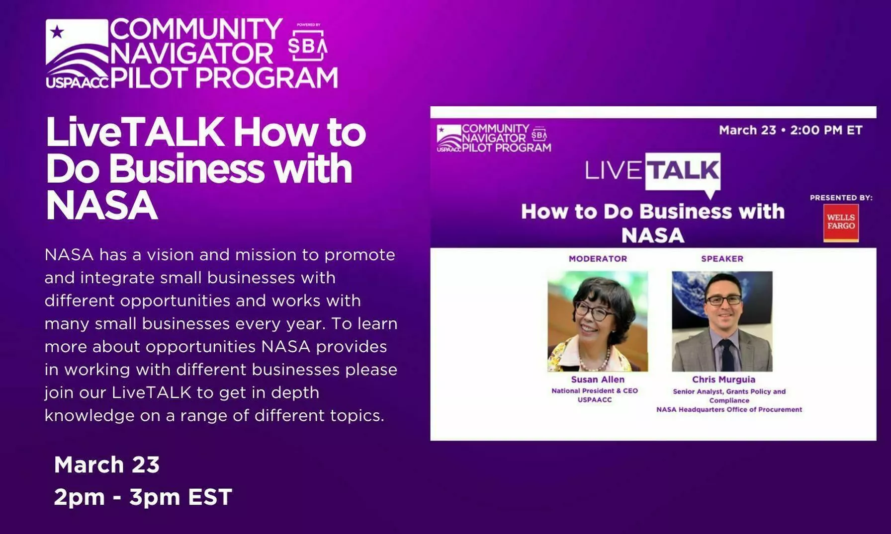 Christopher Murguia Senior Analyst, Grants Policy and Compliance, from the NASA headquarters office joined our LiveTALK to discuss how to do business with NASA, grants, cooperative agreements, and more. To learn more about opportunities NASA provides in working with different businesses please watch our LiveTALK to get in-depth knowledge on a range of different topics.