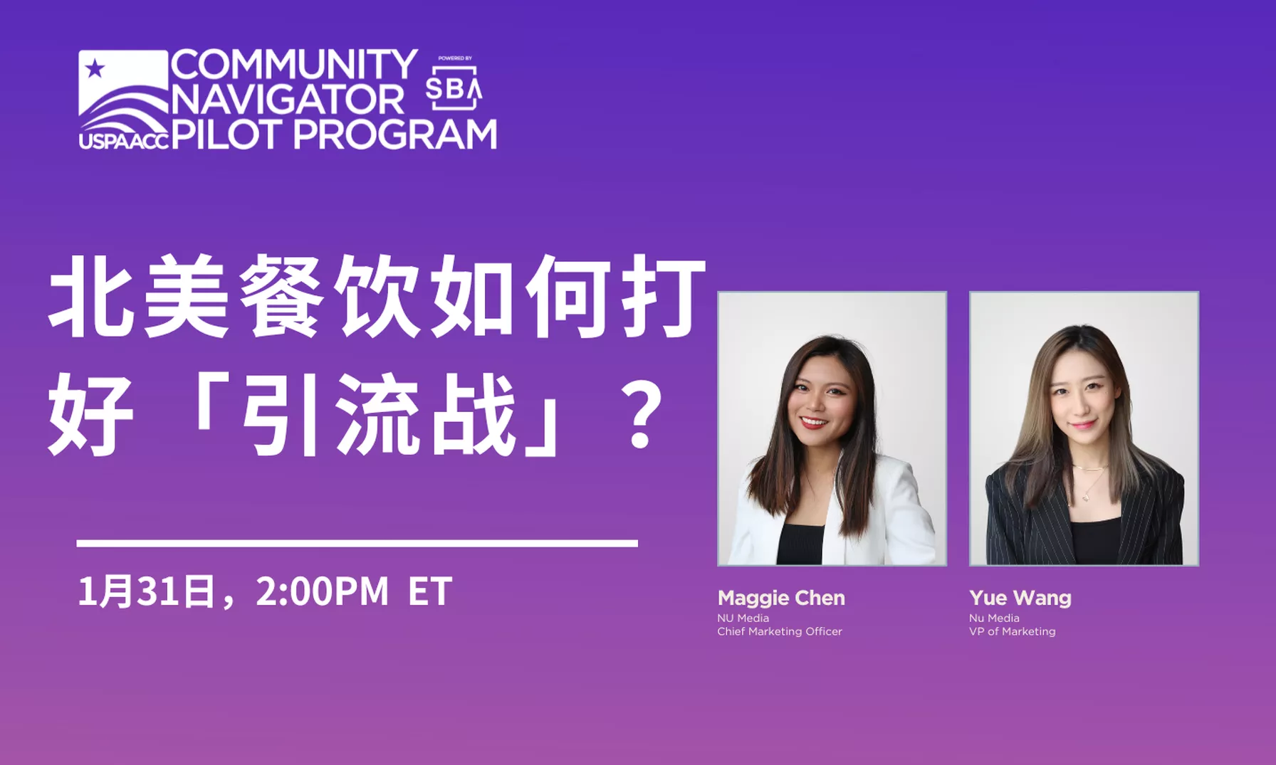 2023年1月19日,美国东部时间下午2点,NU Media 将携手SBA、USPAACC 美国泛亚裔美国人商会以及CNPP 社区导航试点计划,邀请到NU Media 首席营销官Maggie Chen、NU Media 营销副总裁Yue Wang在线上与观众共同探讨餐饮业的引流方法,助力广大餐饮从业者在这个快节奏的行业中脱颖而出。