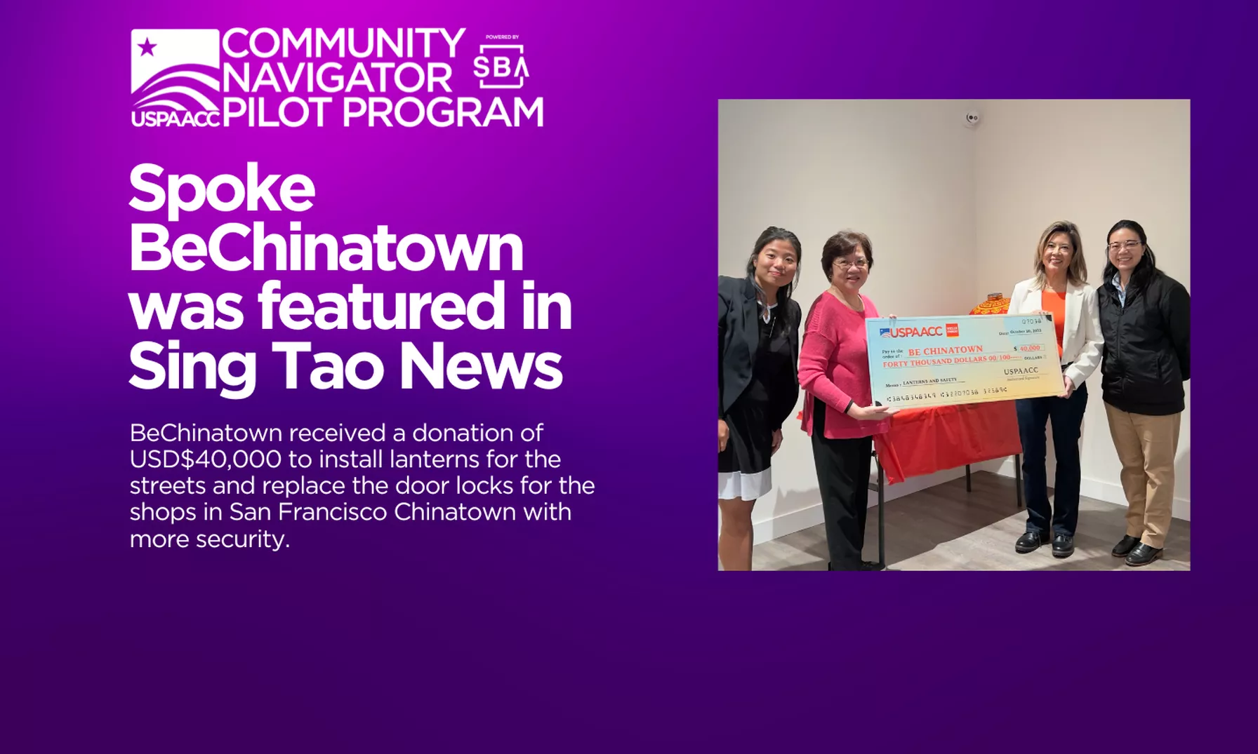 BeChinatown 收到了 USPAACC 和 Wells Fargo 捐贈的 40,000 美元,用於直接資助他們在舊金山唐人街放置燈籠和多項安全舉措的目標。