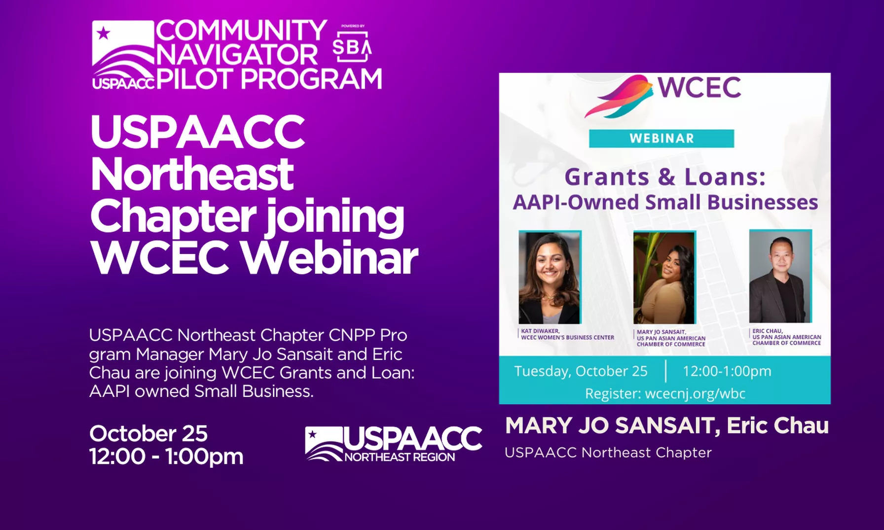 USPAACC Northeast ChapterCNPP Program Manager Mary Jo Sansait and Eric Chau are joining WCEC Grants and Loan: AAPI owned Small Business. This webinar will discuss resources and opportunities for small business owners that identify as part of the AAPI Community (Asian American Pacific Islander).