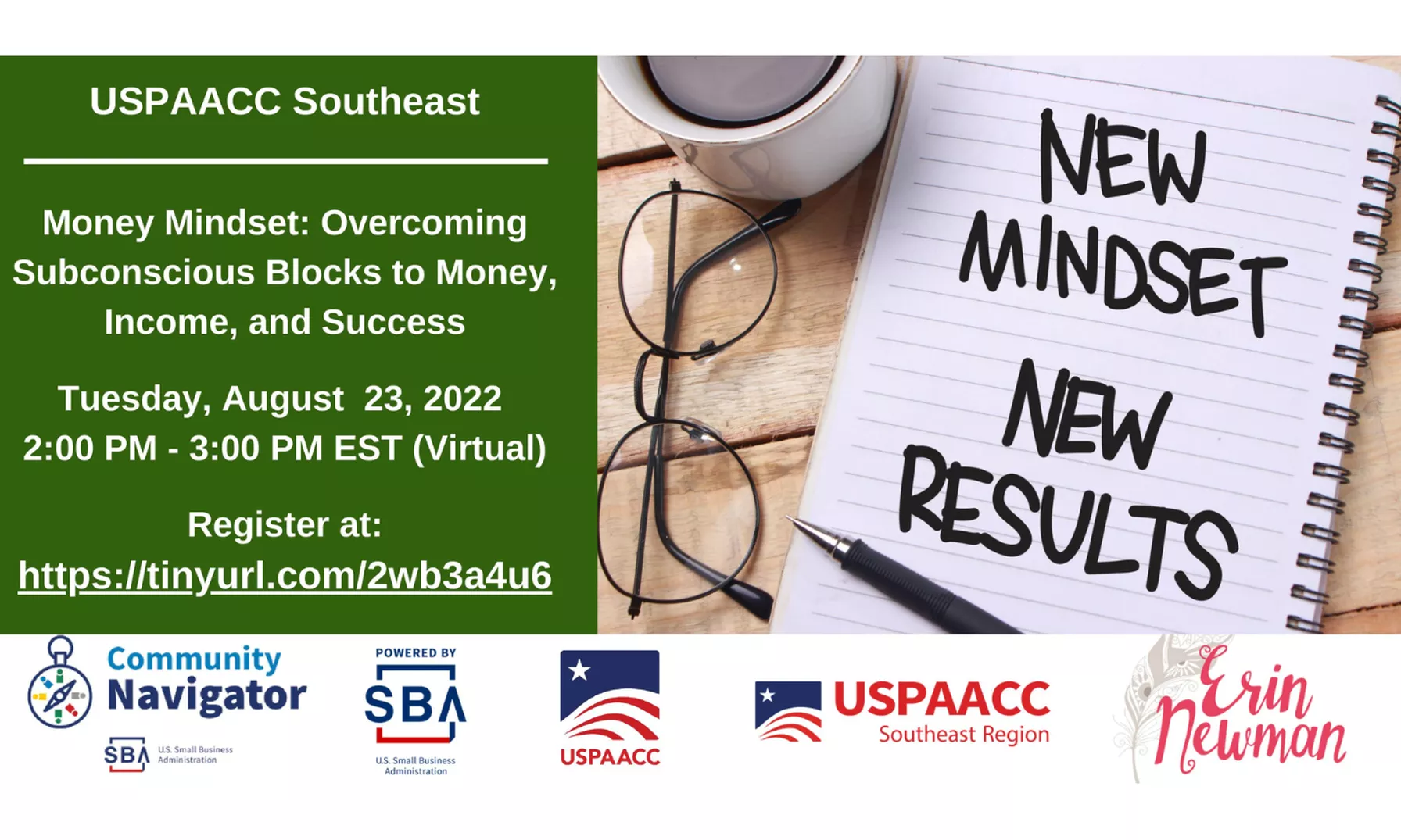 Are you a small business interested in knowing more about creating a success mindset to Money, Income, and Success? Join USPAACC Southeast Chapter and learn how to overcome blocks that deter your business and life successes.